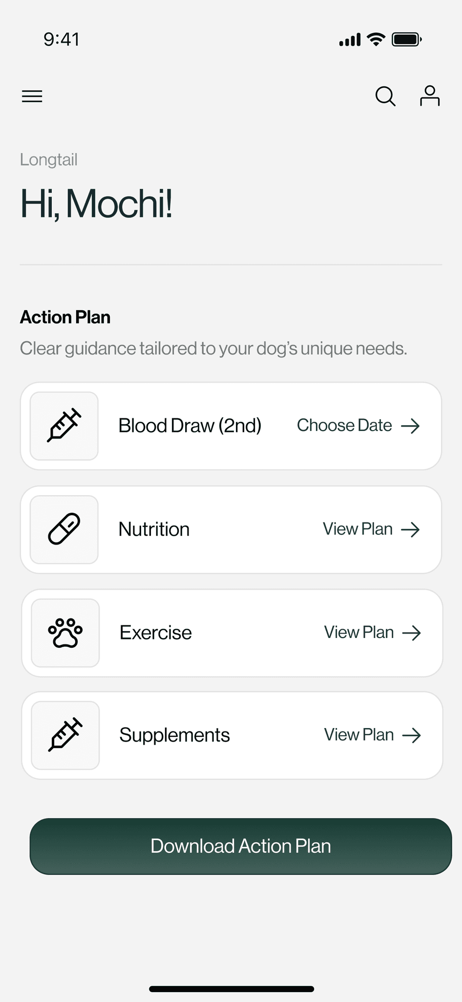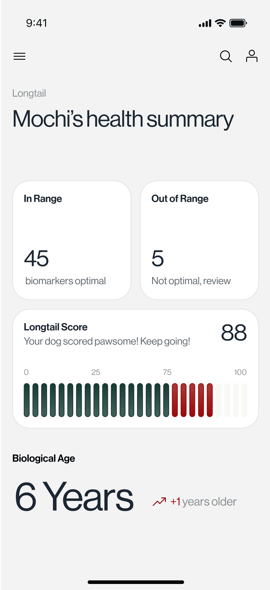 From blood, DNA, and microbiome testing to personalized care plans and seamless vet support—Longtail helps you take control of your dog’s wellbeing, adding more healthy, happy years to every wag.