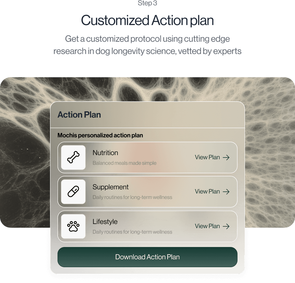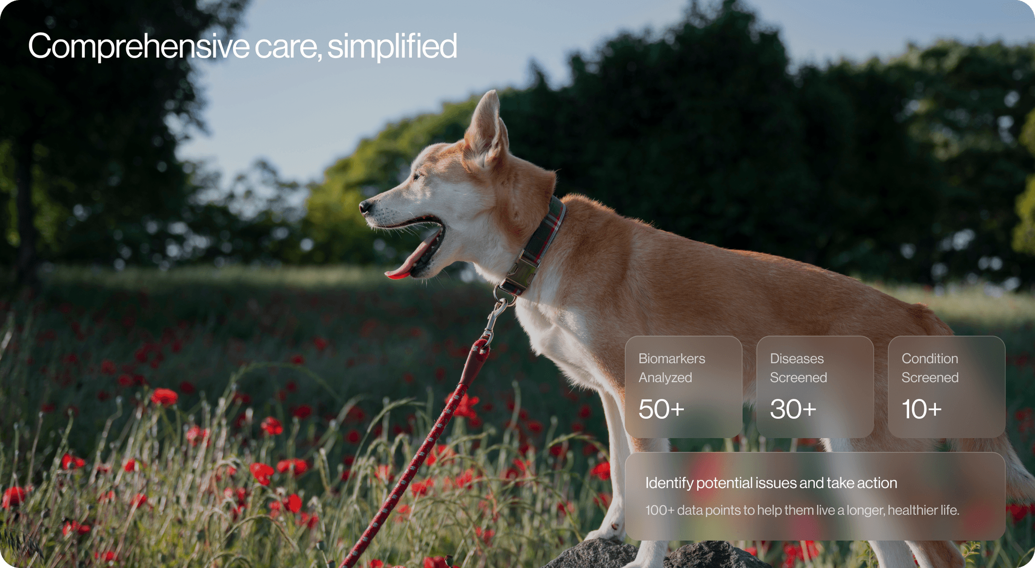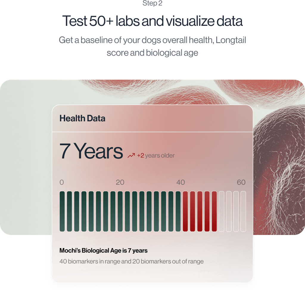 Blood, DNA, and Microbiome testing. Data driven + Vet guided insights. A personalized action plan to extend your dog’s health-span and lifespan